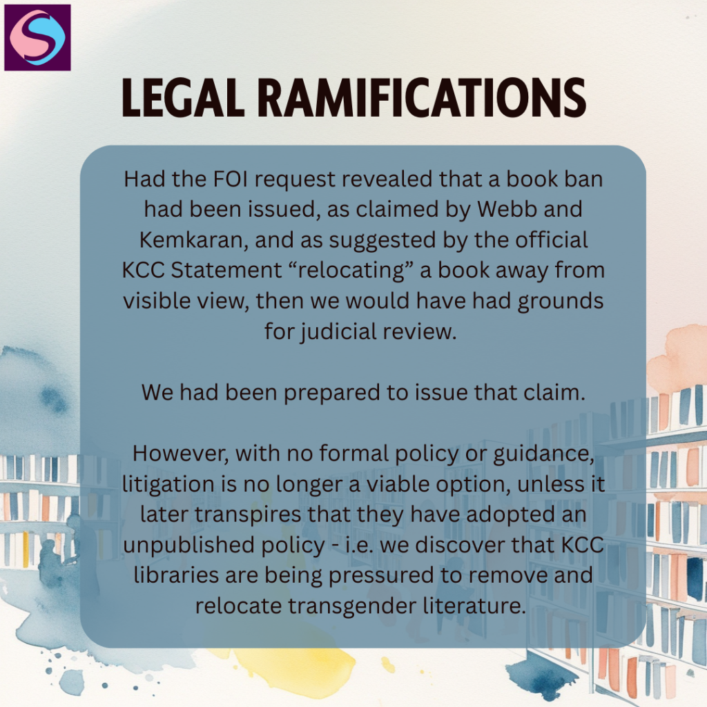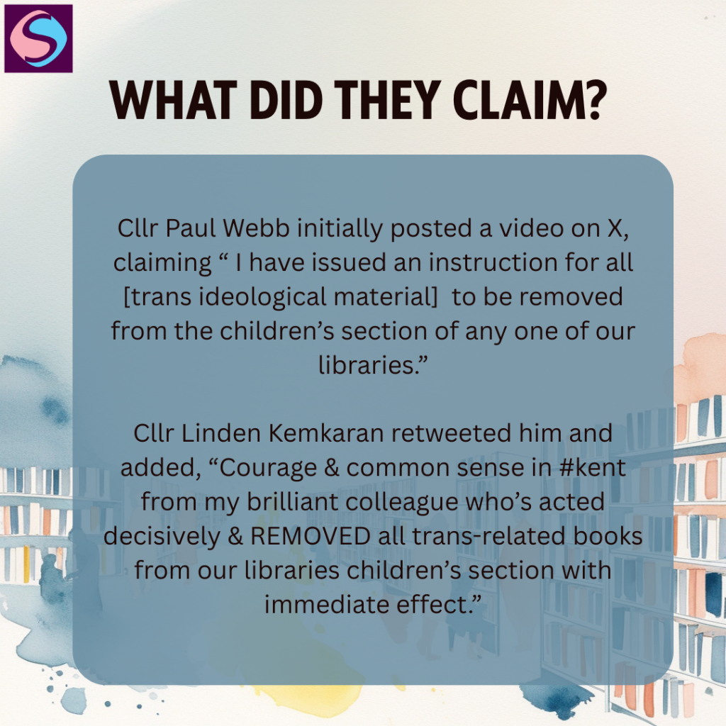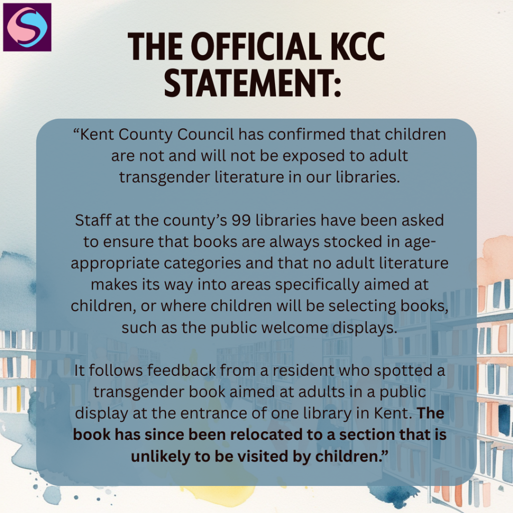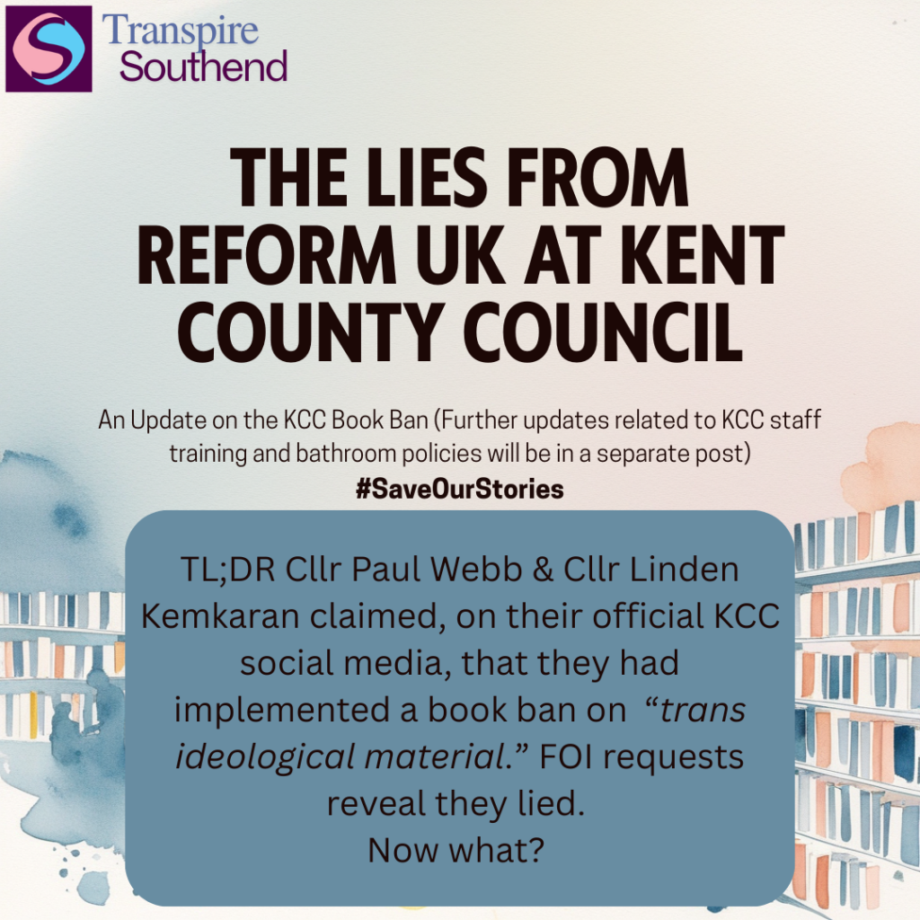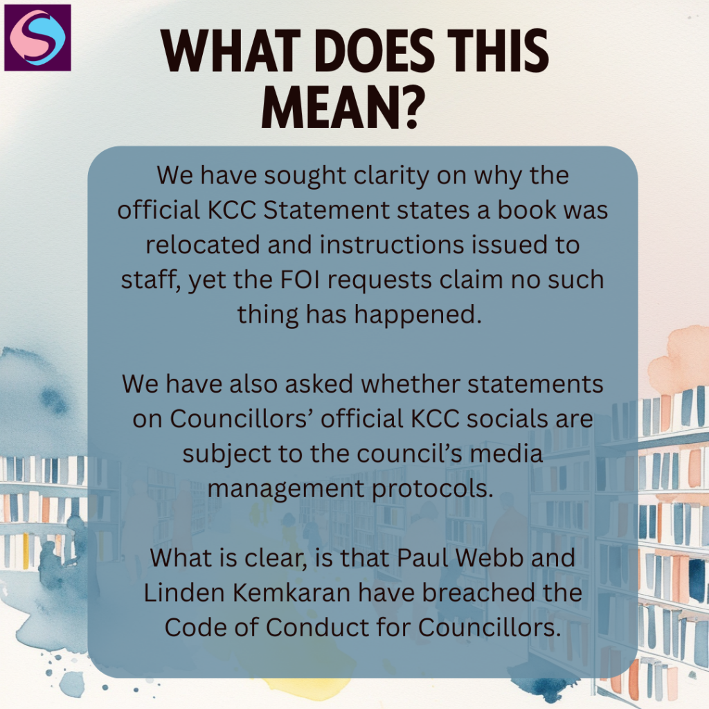 From this, we have discovered that Cllrs Webb and Kemkaran have lied about the removal of books containing transgender content within public libraries. We have sought clarity on why the official KCC Statement states a book was relocated and instructions issued to staff, yet the FOI requests claim no such thing has happened.