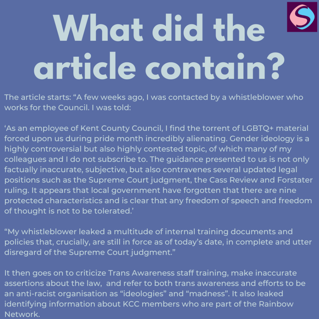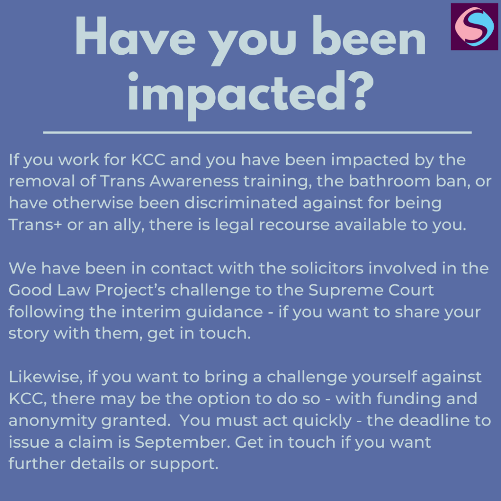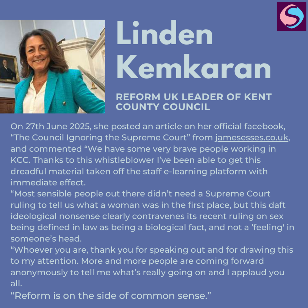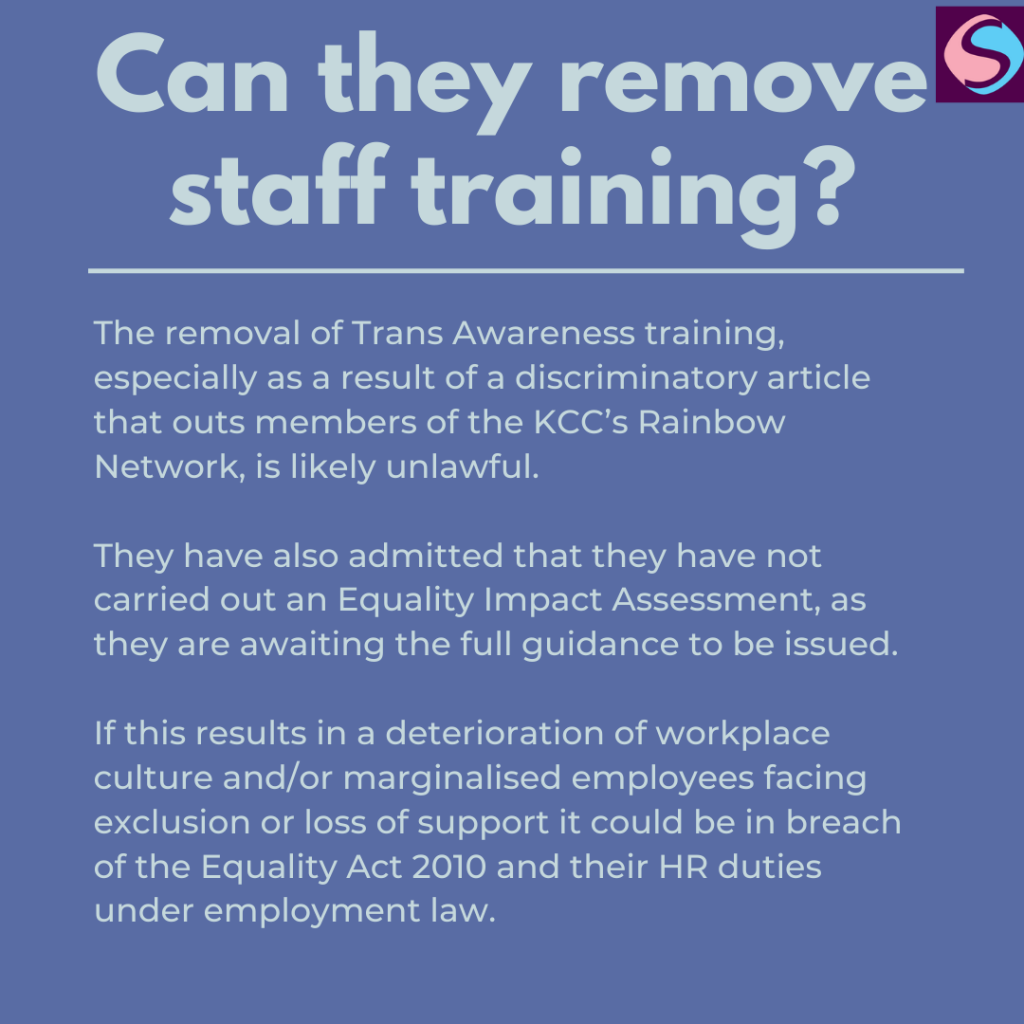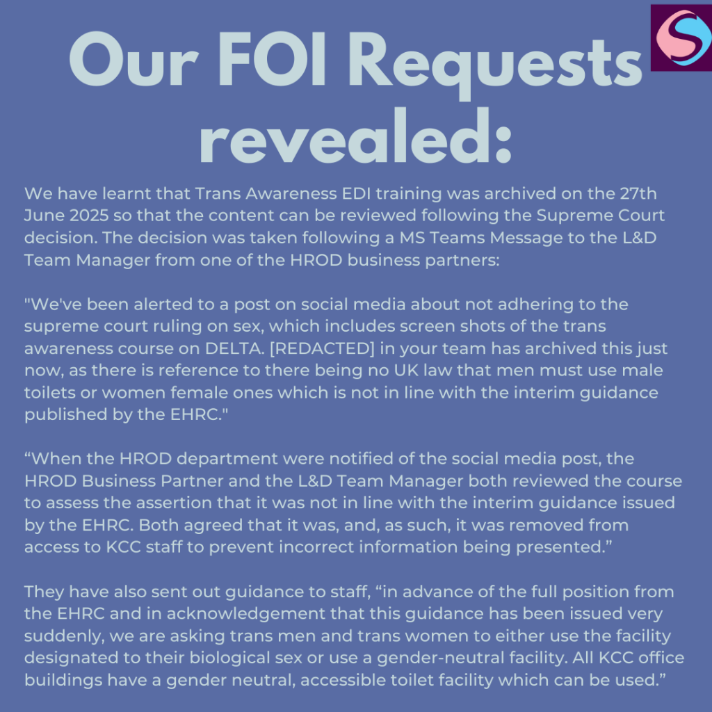 On the 27th June 2025, following a discriminatory article reposted by Cllr Linden Kemkaran which leaked internal training documents, including identifying information on KCC Rainbow Network Members, Trans Awareness training was archived, “as there is reference to there being no UK law that men must use male toilets or women female ones which is not in line with the interim guidance published by the EHRC.”