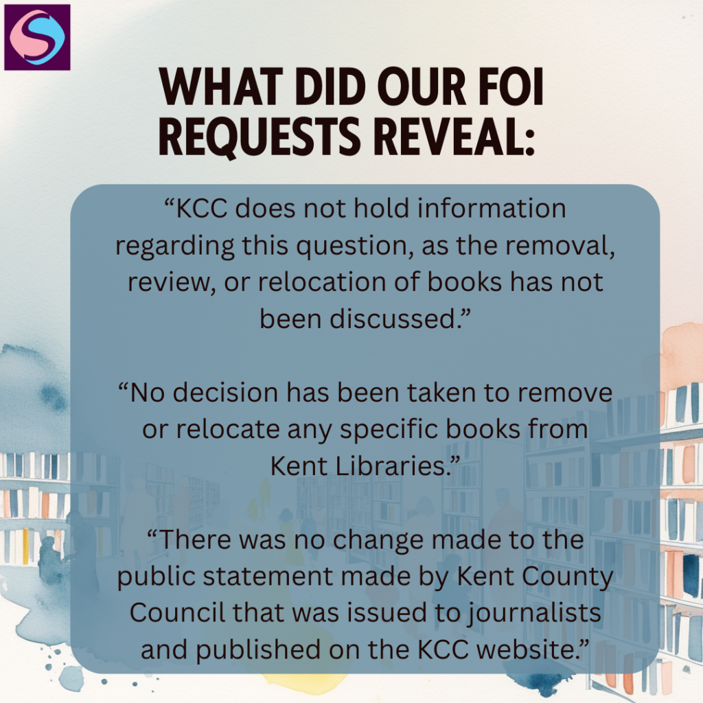 Prior to the FOI requests, we also submitted an open complaint to KCC about the alleged book ban and the removal of staff training. We are currently on stage 2 of the complaint process and will keep you updated. We have also submitted our own complaint about Councillors Webb and Kemkaran, which we are waiting a response from.