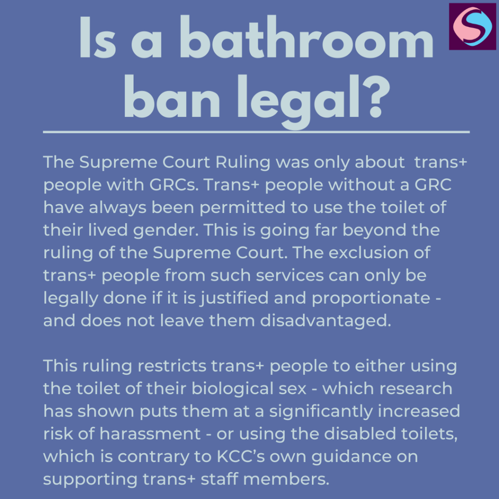 This goes far beyond the Supreme Court Ruling, which should only have impacted upon the rights of Trans+ people with gender recognition certificates. As trans+ people without GRCs have always been permitted to use the bathroom of their lived gender, it does not make sense for this to have not been restricted following this ruling and will likely open you up to further legal challenges.