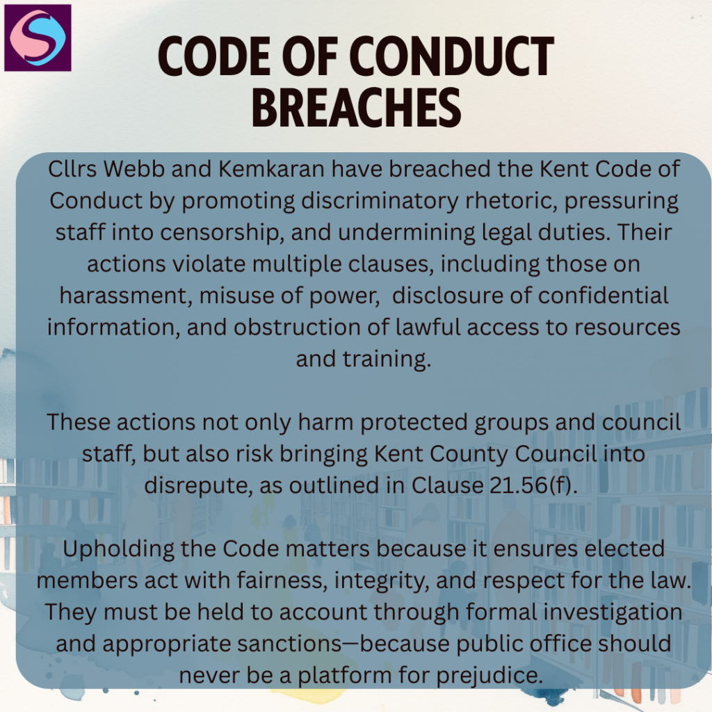 We believe that both Councillors are in breach of KCC’s Code of Conduct for Members. They have publicly denigrated and harassed a protected group by labelling transgender identities as “harmful” or “ideological,” using their official channels to coerce library staff into removing trans-themed books and withdrawing trans-awareness training. In doing so they breached the Code’s prohibitions against offensive or abusive behaviour (21.56(a)), intimidation of staff and potential complainants (21.56(b)), misuse of power that undermines professional integrity (21.56(c)), disclosure of confidential internal materials (21.56(d)), and denial of lawful access to information and training required under statutory equality duties (21.56(e)).