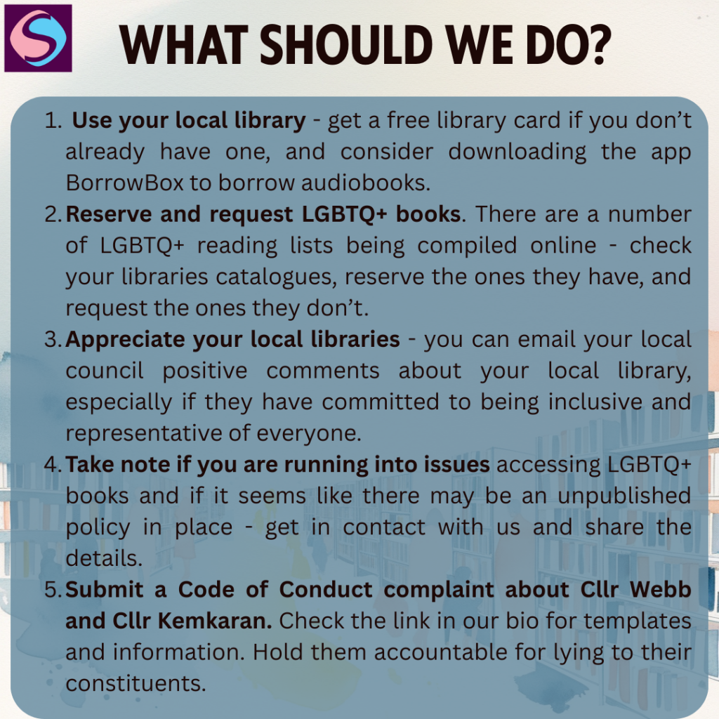 [OPTION TO PERSONALISE] As a constituent of [YOUR CONSTITUENCY], I am deeply concerned because… As someone who works in or uses our local libraries, I feel… As an LGBTQ+ ally/trans community member, this matters to me because… As someone who cares about equality…